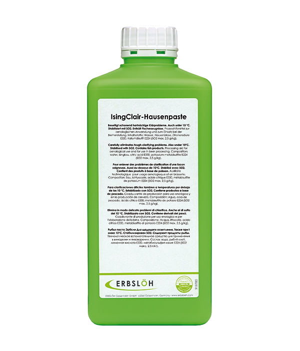 IsingClair-Hausenpaste is a product which is prepared according to modernst findings by a special process of comminution and digestion which does however, not at all affect its efficiency. Subsequently, the product is SO2- stabilized. Isinglass, produced in that way, has no longer the disadvantage of being difficult to dissolve because this "household remedy" of long standing for vinification must not be squeezed, cut and, above all, not be pulverized in order to preserve its full efficiency. Because of the troublesome plucking prior to decomposition, this natural and efficient fining agent was only rarely used. IsingClair-Hausenpaste is available as a 2% isinglass gel and is based on the original foliated isinglass of first-rate quality. Permitted according to the laws and regulations currently in force. Purity and quality are proved by specialized laboratories.